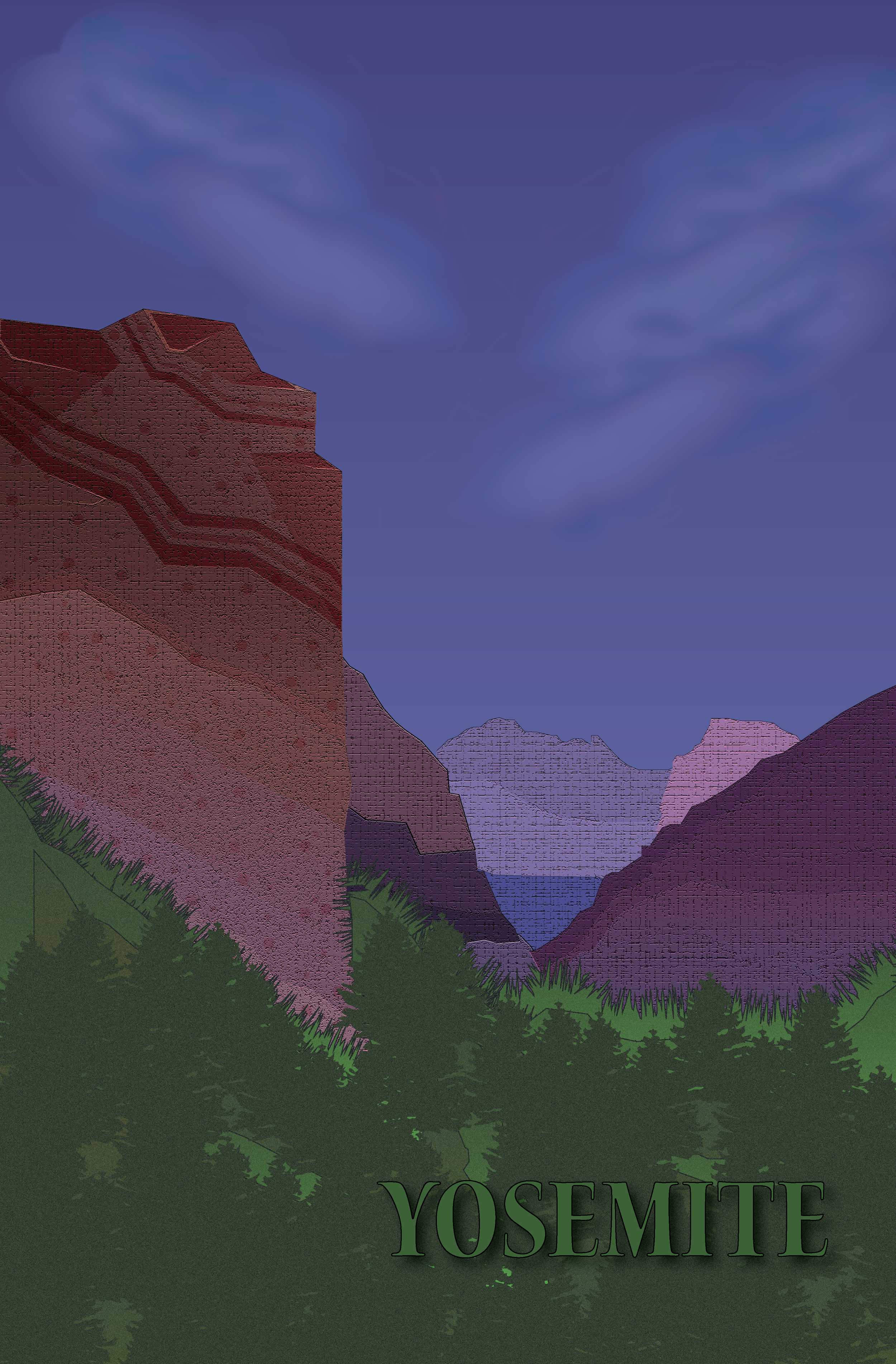 Created in 2024 for my Illustration Graphics course, this piece was designed using Adobe Illustrator to capture the serene beauty and grandeur of Yosemite National Park. The textured layers of rocky cliffs, misty mountains, and deep green forests are arranged to guide the viewer’s eye through the valley and into the horizon. By using stylized gradients and rich earth tones, the composition honors Yosemite’s natural wonder while maintaining a sense of calm and timelessness. This design invites viewers to pause, breathe, and reflect on the vast, untouched beauty of nature preserved within this iconic landscape.